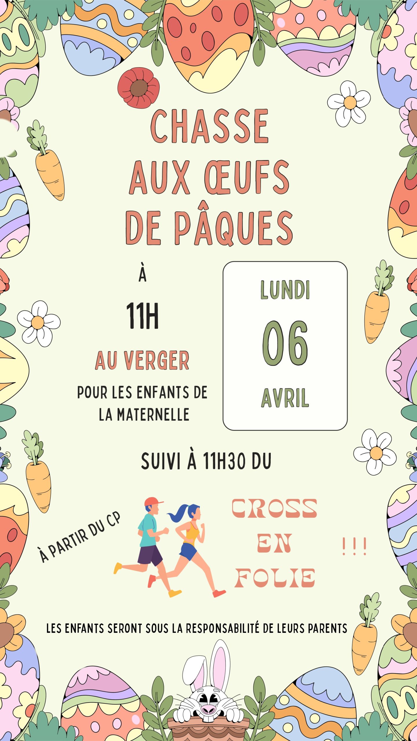 Chasse aux oeufs de Pâques, pour les enfants inscrits, à partir de 11h le lundi 6 avril au verger
