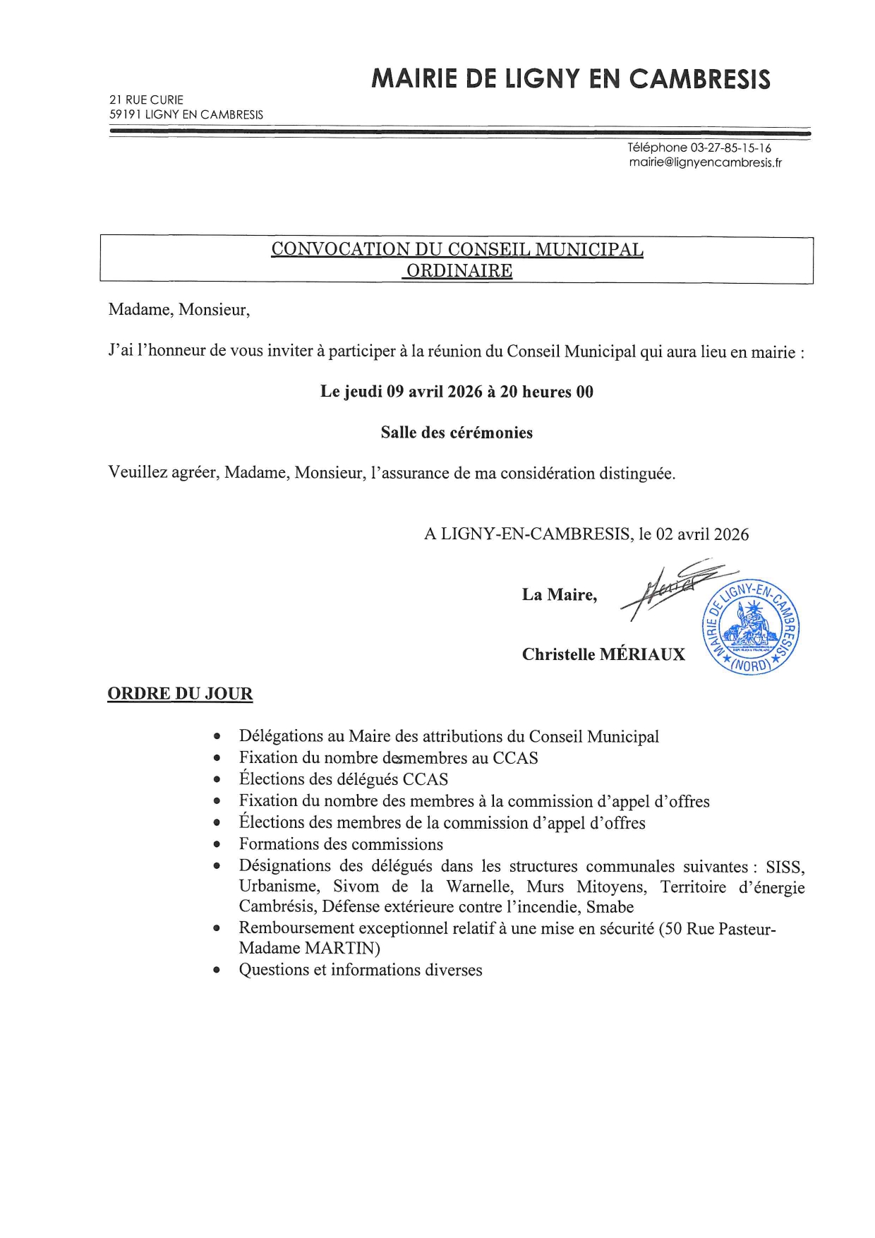 Convocation du conseil municipal le jeudi 9 avril à 20h